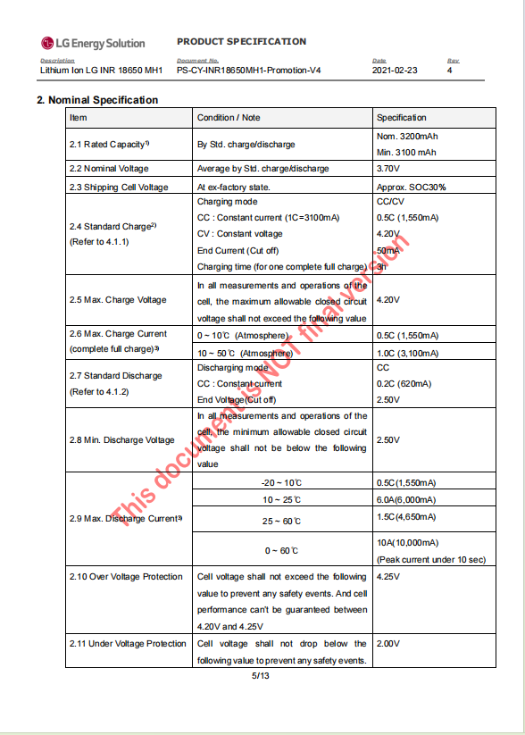 The LG MH1 has a nominal capacity of 3,200 mAh, making it one of LG’s higher-capacity 18650 cells.